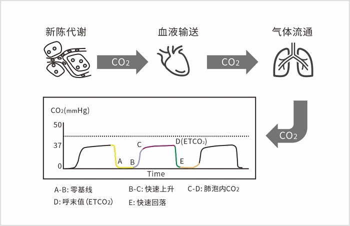 正常的ETCO2波形圖如下,A-B為吸氣基線,是呼吸道內(nèi)死腔氣,基本不含CO2,數(shù)值為0。B-C是肺泡和無效腔的混合氣,曲線快速上升。C-D為肺泡氣,CO2曲線水平或者輕微向上傾斜,D點值稱為ETCO2值。D-E重新開始吸氣,新鮮氣體進入氣道,CO2曲線迅速下降到基線水平。