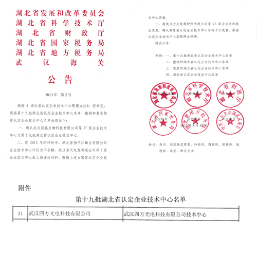 2013年8月12日,我公司技術(shù)中心被湖北省發(fā)展和改革委員會、湖北省科學技術(shù)廳、湖北省財政廳、湖北省國家稅務局、湖北省地方稅務局、武漢海關(guān)聯(lián)合認定為“省級企業(yè)技術(shù)中心”,預示著我公司科技創(chuàng)新工作揭開了新篇章。