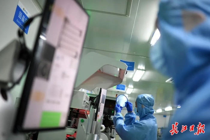 四方光電芯片車間,研發(fā)生產(chǎn)人員正進(jìn)行激光器芯片的固晶程序。長江日報(bào)記者周超 攝